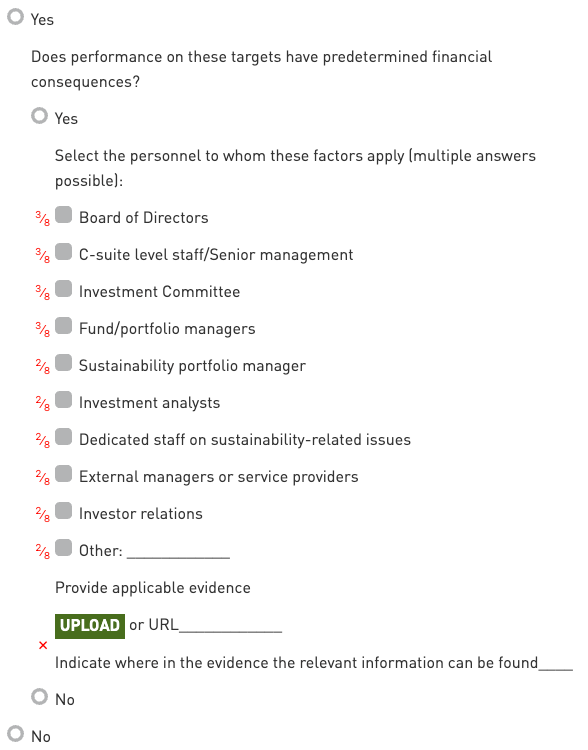 If sustainability objectives are specific to certain personnel groups, the evidence must clearly link the targets to only those groups. For example, a performance review template that explicitly requires asset managers to meet carbon emission reduction targets for client travel would suffice.