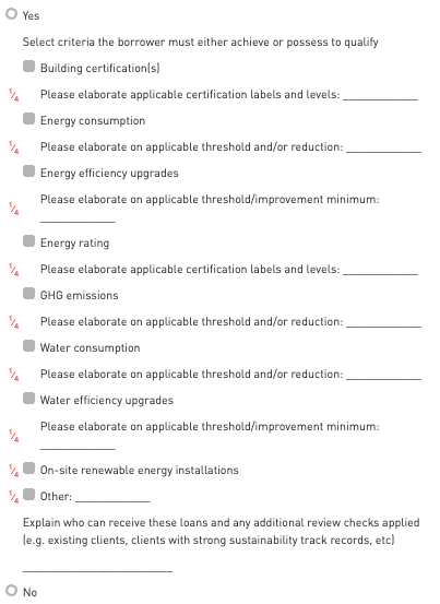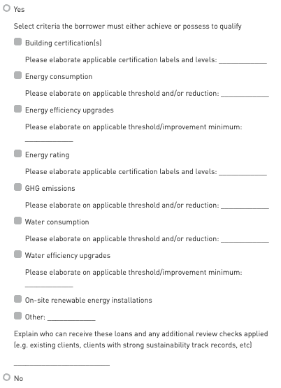 The focus is on understanding whether the lender offers loans aimed at positive environmental impact and what qualifying criteria apply. Participants should select the criteria the borrower must either achieve or already possess to qualify.