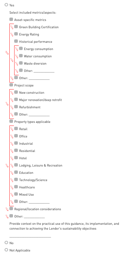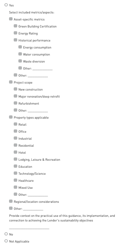 Participants should select all sustainability-related requirements that are present in the commercial real estate lending policy/guidance document (see LPO1). Please elaborate on implementation actions.