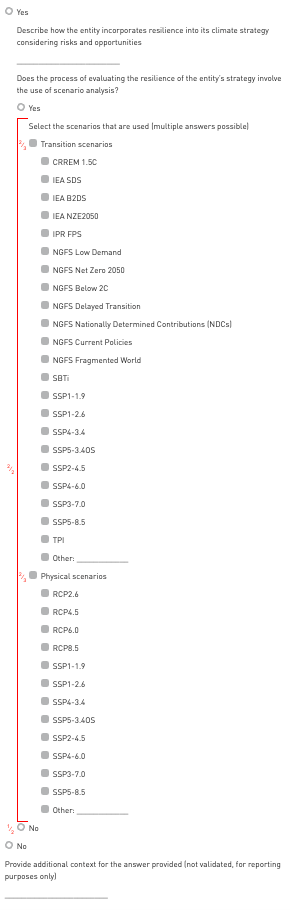 This indicator assesses how clearly the entity articulates its strategy for managing climate-related risks and opportunities. A well-defined strategy helps fund managers respond to shifting conditions, align resilience considerations with broader business objectives, and evaluate how a transition to a lower-carbon economy may affect the entity.