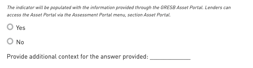 This Indicator intends to assess the lender’s use of green building certifications for building operation and maintenance. Green building certificates provide a measure of asset quality that may provide benefits for occupants, society and the environment. Building certifications also serve as an additional layer of transparency and accountability to inform investors and occupiers on the sustainability performance of an asset.