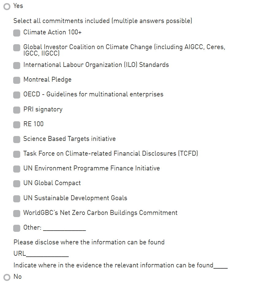 This indicator assesses the entity's commitment to sustainability leadership standards or principles. By committing to sustainability leadership standards or principles, an entity publicly demonstrates its dedication to following and/or complying with universally accepted organizational frameworks.
