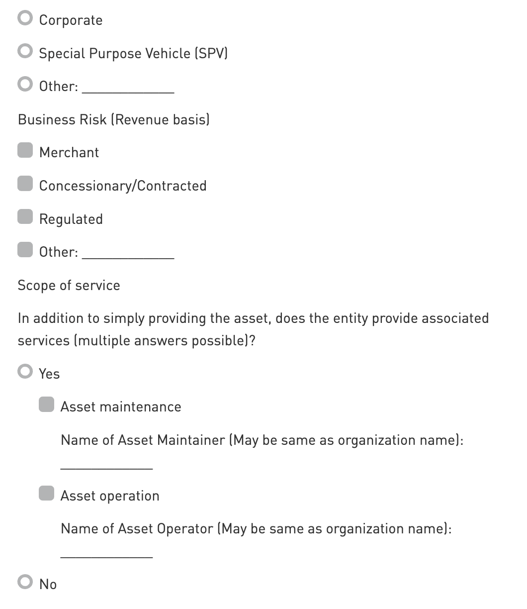 Scope of Service: Select whether the entity provides associated services in addition to providing the asset itself. The associated services may be Asset Maintenance and/or Asset Operation. This section then determines whether the Scope of Service provided by the entity is: