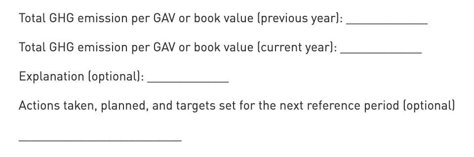 Calculated field: The carbon footprint is calculated based on the total greenhouse gas emissions and GAV of the entity. The calculated value will appear on the SFDR report of the entity.