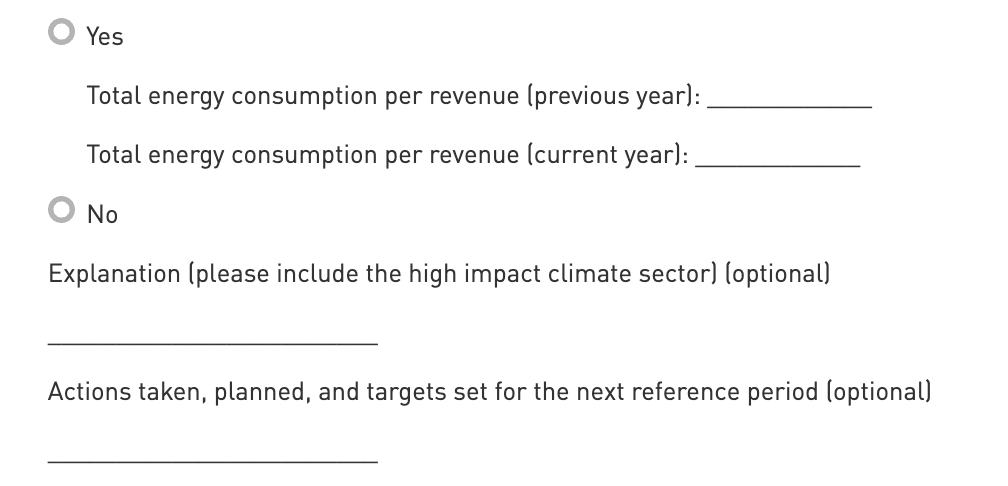 The intent of this indicator is to assess the entity’s energy consumption intensity per high-impact climate sector.