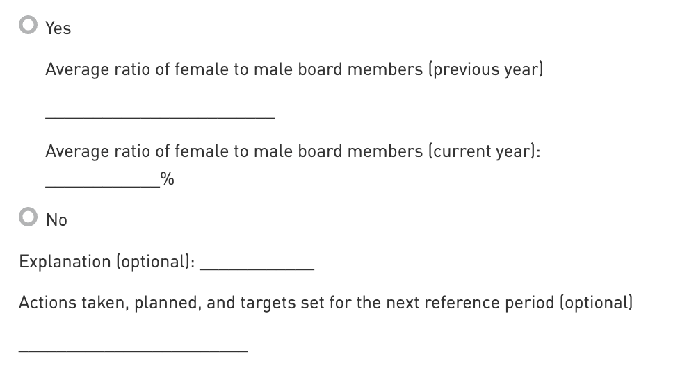 The intent of this indicator is to assess the entity’s average ratio of female to male board members.