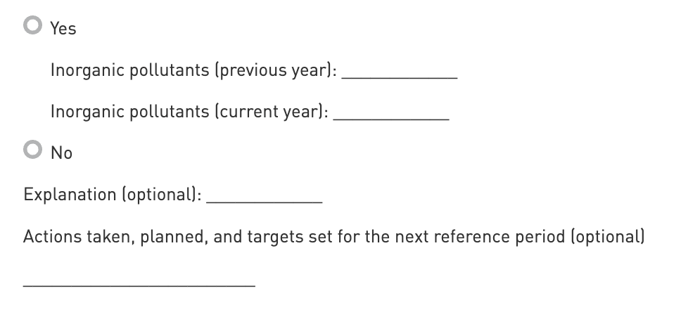 The intent of this indicator is to assess the entity’s emissions of inorganic pollutants. This indicator is considered to be optional for SFDR.