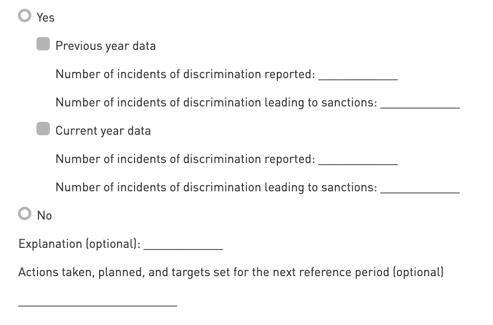 The intent of this indicator is to assess the entity’s incidents of discrimination. This indicator is considered to be optional for SFDR.