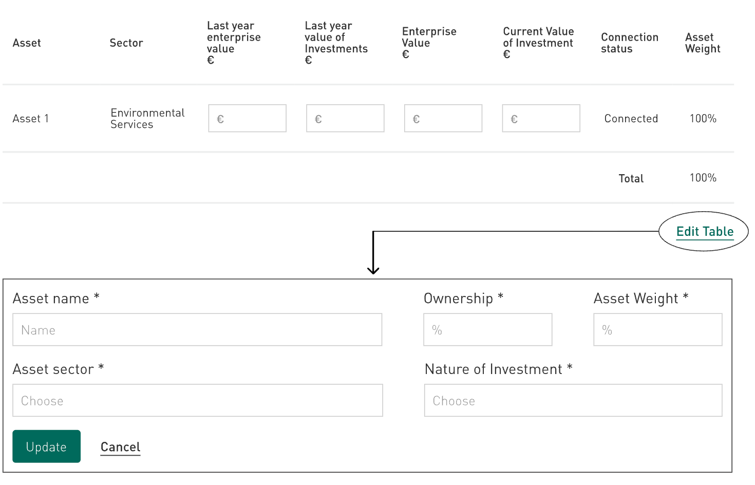 % Ownership: Enter the fund’s % ownership share in the asset as a proportion of the asset’s total GAV i.e the fund’s investment in the asset divided by the asset’s total GAV. Please note that this does not apply to the PAI aggregations as the SFDR requires the Current Value of Investment/Enterprise Value as the relevant metric for ownership.